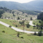[Decision to split the ride from Bansko to Dospat was a good one. If I had tried that I would have been looking at over 8 hours riding and the way I felt yesterday would have never made it. The shorter day gave me some needed rest.] I got into Dospat about 2:00 and tried to catch a ride into Smolyan for about an hour. I then tried to find a hotel – there is a state hotel that wasn’t working and looked like a dump. Then went to the bus station and asked about a state bus to Smolyan and was told only at 6:20 in the morning. The clerk also told me of a private hotel but when I found it, it was also locked. At a nearby garage the mechanic tried to telephone and about that time the manager/owner came back. He promptly moved me in! No money, no paperwork, no problem with my bike, nothing – he said we will do that later. However, there is no hot water so that will be later also! Photo #16 & #17 were taken near Gotse Delchev of the Pirins west of the town and the Rhodopes to the southwest. There were black storm clouds all day and also a very cold wind; fortunately it was at my back most of the time. Photo #18 is a very typical Rhodope Mountain view; the far peak is probably in Greece. All other possible pictures were blocked with trees along the road (what a concept it would be to develop Viewing Areas where cars, and bikes, can pull off the road and people can take unobstructed pictures). The restaurant in the hotel was closed but the owner called in the cook to make me dinner. Never asked me for anything and charged me the Bulgarian rate for the room. I’m back in the Rhodopes!