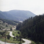Two scenic pictures of a twisty road in the Rhodopes then a picture of the dam and reservoir at Dospot. The gash in the mountain side is a collapsed lead mine tunnel just down from the pass summit. The first picture in the second row is from the last pass that I did not get to ride: it would have been almost all down hill for some 16 Km. This is the headwaters of the Verbitsa River with Zlatograd in the distance. The last picture, “Pines in the Oaks” , was taken through my hotel window at Smolyan and marks the end of my TAB.