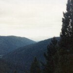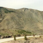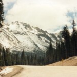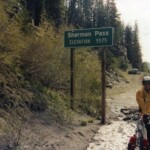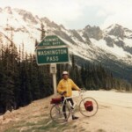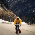 Two pictures of the climb up through the North Cascades. The first major pass of the day at the 43 mile mark and over 4,300 feet of climbing – Rainy Pass. Well named because we had rain most of the way to the summit that turned to snow. Then there are two pictures of the climb up the western slope to Washington Pass and the summit Washington Pass (where I’m pictured), the second pass of the day. The last picture was taken by a a commercial photographer that set up on the east slope of Washington Pass, took my picture and had it posted for sale at our camp in Winthrop.