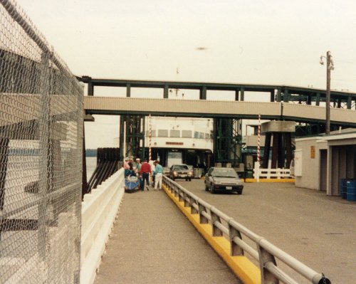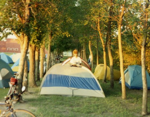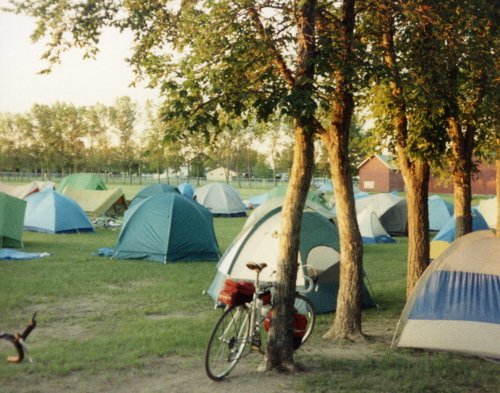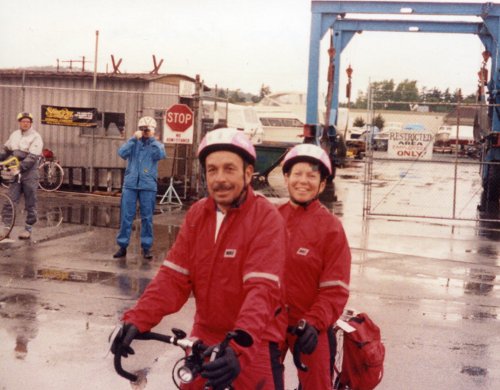 The first picture is of our starting point, the ferry dock at Anacortes, WA. The second one is of John & Janice of Placerville, CA who arrived yesterday afternoon and set up their tent next to mine. They had ridden their tandem from Placerville to Anacortes; over 1,000 miles to start this cross country ride and were considering riding back to Placerville from Maine. Since I was living in Roseville, CA prior to this ride we were practically neighbors and developed a friendship that continued after the ride.