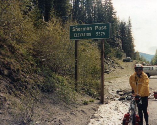 Two pictures of the climb up through the North Cascades. The first major pass of the day at the 43 mile mark and over 4,300 feet of climbing – Rainy Pass. Well named because we had rain most of the way to the summit that turned to snow. Then there are two pictures of the climb up the western slope to Washington Pass and the summit Washington Pass (where I’m pictured), the second pass of the day. The last picture was taken by a a commercial photographer that set up on the east slope of Washington Pass, took my picture and had it posted for sale at our camp in Winthrop.