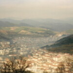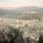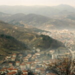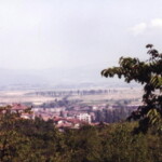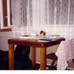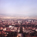 Two pictures of Kyustendil from the hills that border it to the east. My “host family” (The Miladinvi’s – Ivo, Silvia & Svetly) at the Peace Corps swearing-in and party (I think I’m about half in the bag). There was a younger daughter (Adi) that did not come not did the Grandparents or the brothers family (we all lived in a three story family house). My study desk in the children’s room; they were moved out so the family could get the money for my staying there. Everything I had with me was in the large bag on the floor to the left rear.