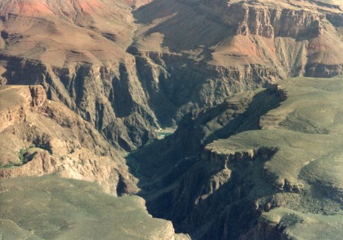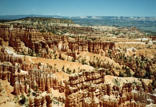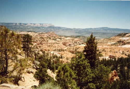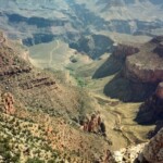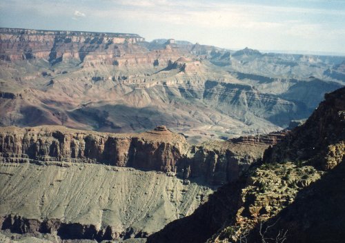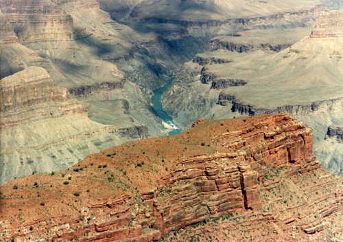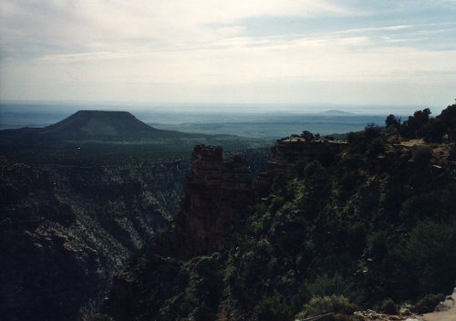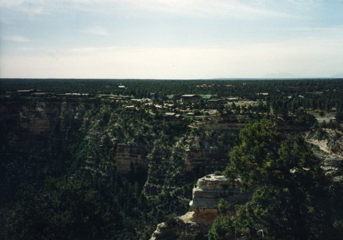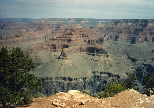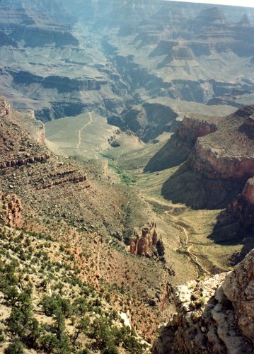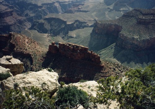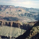 The first two pictures were taken from a location west of Grand Canyon Village and the first shows Bright Angel Trail. During Easter Vacation (maybe 1963), while I was at the University of Arizona, three of us hiked down the Kaibab Trail, overnight at Bright Angel Campground, overnight at Indian Garden Campground and then up the trail that you see. The second one shows the Bright Angel Lodge Complex on the canyon rim. Then two pictures of the Grand Canyon from near Hermits Rest (I think). In the second one you can see just a bit of the Colorado River in the center of the picture.