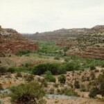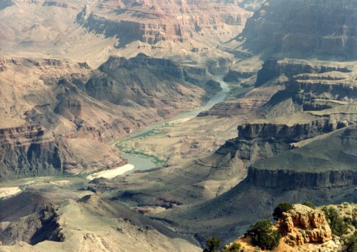 Two more shots of the canyon from near Grand Canyon Village (maybe) and two of the Canyon east of Grand Canyon Village. Two pictures of the canyon that also shows the Colorado River. The first one has some of the rapids in the center of the picture, the second shows more of the river than you can see from most of the viewing points. Then that is yours truly the morning that we rode east out of the Park to Tuba City. Last is looking east toward Tuba City as you leave Grand Canyon National Park.