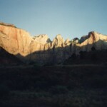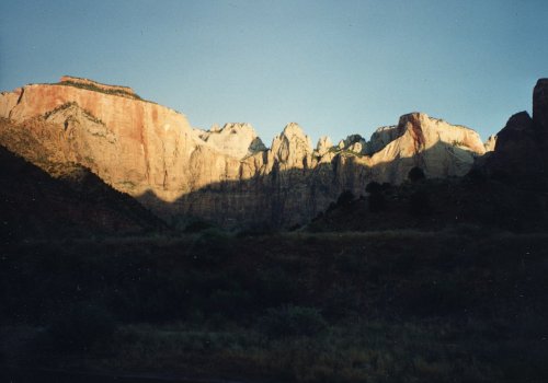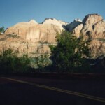 Two pictures of the mountains in Zion Park in the early morning. Then two of the road east of Zion Park and a typical view of Long Valley near Orderville that goes up to the turn off for Bryce Canyon.