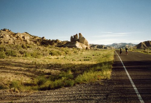 I just thought yesterday was tough. Today we had an easy time of it for about the first 50 miles to Hanksville but then turned south to a gradual uphill and into a headwind. Then when we thought it couldn’t get worse it got hotter and there were two steep climbs at the end of the day. There were a lot of people quit to take the ‘sag wagon’ today, there was a point where I stopped to rest that I would have probably done the same if one had come by.