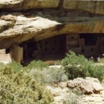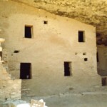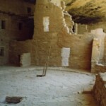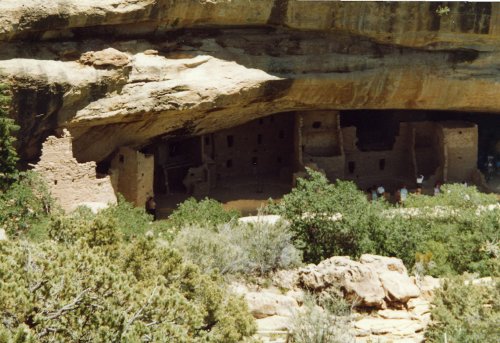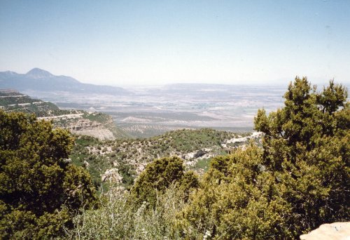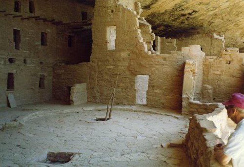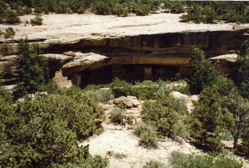 The first photo is from the top of Mesa Verde looking down toward Cortez (I think). Two pictures of some of the cliff houses from the top of the mesa. Then two pictures of the same cliff houses from close up. In the first one you can see two openings in the courtyard that lead down into the kiva. The last picture shows how well the cliff has preserved the houses.